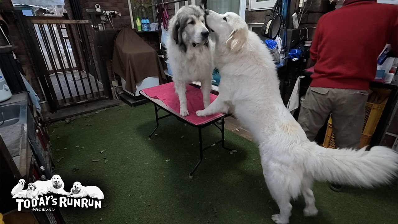 ルンルン家では毎朝散歩から帰ると1頭づつトリミング台にのせてブラッシングをしています。全身を濡れタオルで拭いて、ブラシを入れて、耳の掃除や歯磨きをします。グレートピレニーズは長毛種のため毎日ブラッシングをしないと毛が絡まってボソボソしてしまいます。