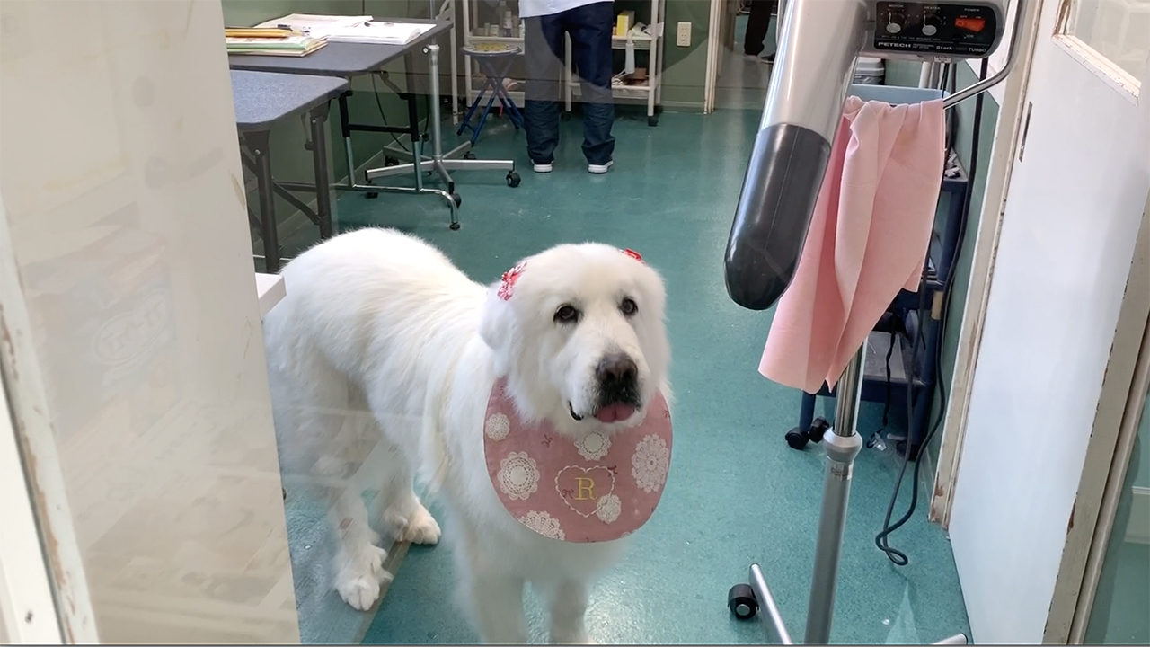 ルンルンのシャンプーはだいたい月に1回です。グレートピレニーズは毛量が多いため乾かすのに専用のドライヤーが必要になるためシャンプーはトリマーさんにおまかせしています。日常的には毎日のブラッシングと濡れタオルでの体拭きです。