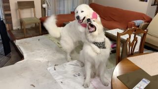 ご近所のクッキーちゃんとクラウス君が遊びにきてくれました。元気いっぱいのクッキーちゃんにタジタジのアランです。Cookie and Claus who live in the neighborhood came to play. Alain...